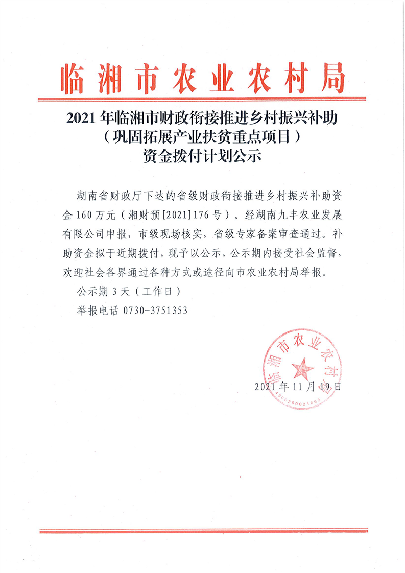 2021年临湘市财政衔接推进乡村振兴补助(巩固拓展产业扶贫重点项目)资金拨付计划公示