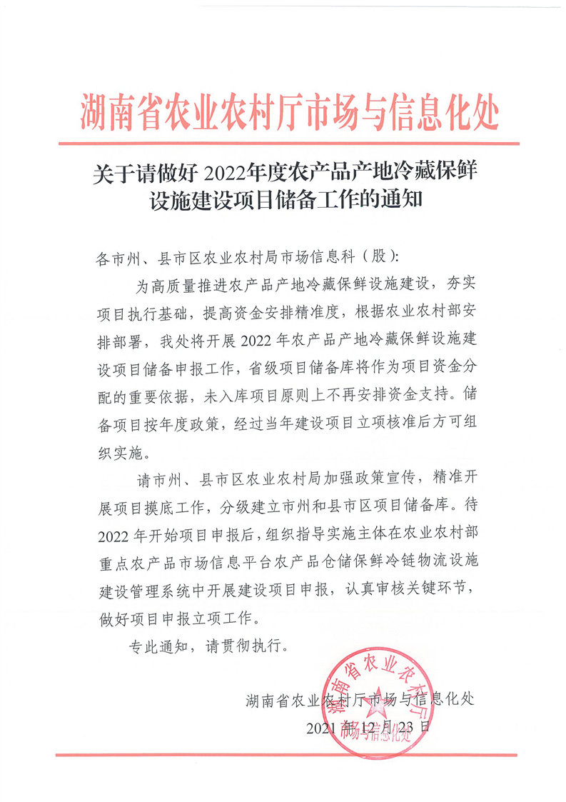 做好2022年度农产品产地冷藏保鲜设施建设项目储备工作的通知