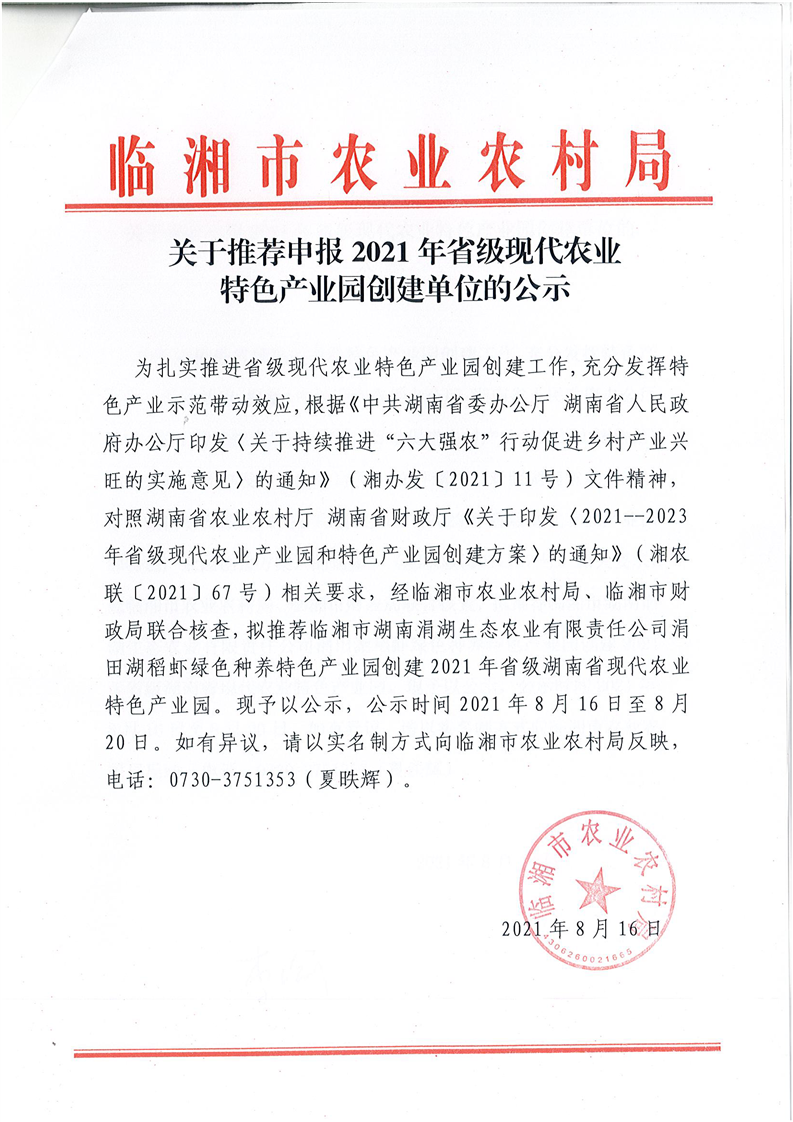 关于推荐申报2021年省级现代农业特色产业园创建单位的公示