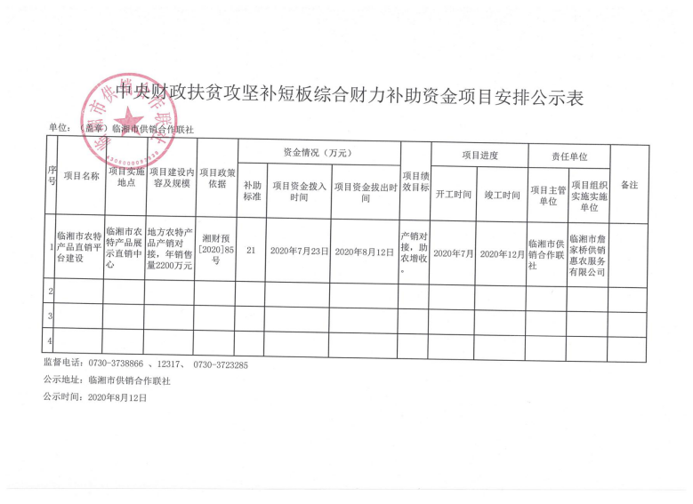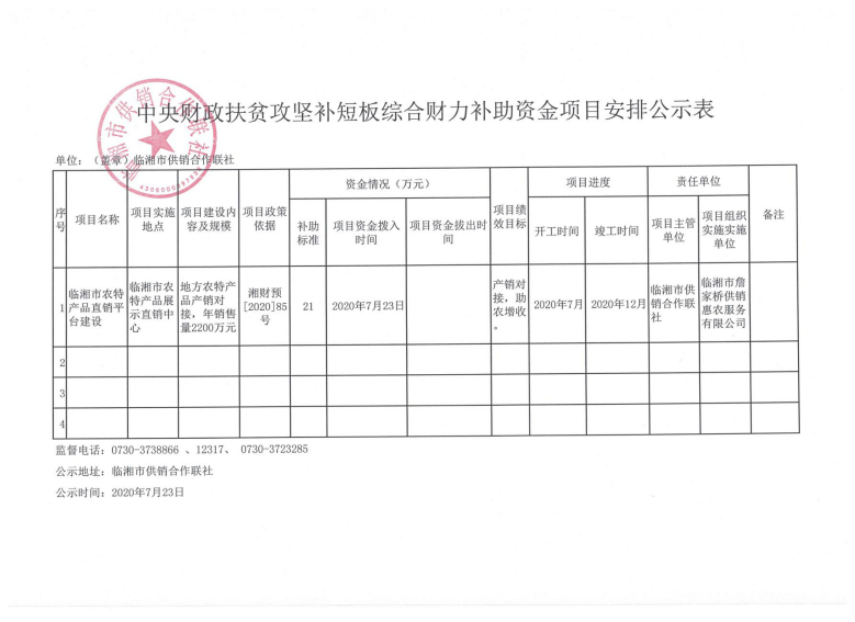 临湘市农特产品展示直销中心建设及中央财政扶贫攻坚补短板补助资金项目安排情况公示