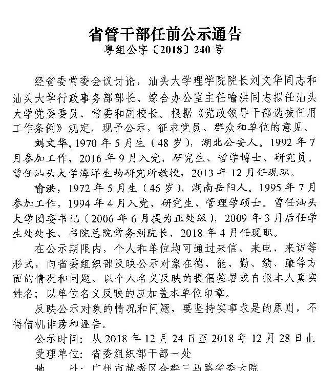 1月8日下午,汕头大学党政领导班子换届考察大会在科技中心报告厅召开。学校领导班子成员、中层副职以上干部、三级以上教授和各类代表参加本次会议,会议由校党委书记、校长姜虹主持。 会上,考察组组长、广东省委组织部干部五处调研员熊文飙作有关考察推荐说明。熊文飙指出,要高度重视学校党政领导班子换届考察工作,准确把握人选条件,有序参与换届考察工作,严肃换届工作纪律。熊文飙说明了换届有关政策规定和本次换届工作的安排,对做好换届考察工作提出了具体要求。 熊文飙宣读省委有关干部任免通知。任命冯兴雷同志为汕头大学纪委书记,任命喻洪同志、陈敏同志、刘文华同志为汕头大学副校长,任命喻洪同志为汕头大学党委常委,任命陈敏同志、刘文华同志为党委委员、常委,免去林丹明同志、乌兰哈斯同志汕头大学党委常委、委员职务,免去林丹明同志、乌兰哈斯同志、冯兴雷同志汕头大学副校长职务。熊文飙充分肯定和感谢林丹明同志和乌兰哈斯同志为学校改革发展做出的成绩和贡献,介绍了陈敏同志的基本情况。 姜虹代表学校第四届党政领导班子作述职报告。姜虹从“全面加强党的建设,把握社会主义办学方向;以立德树人为本,合力构建‘大思政’格局;坚持核心追求,持之以恒推动教育综合改革”三方面,系统总结了自第四次党代会召开以来学校领导班子的履职工作。姜虹表示,学校的发展离不开上级党委的正确领导,离不开李嘉诚基金会的大力支持,离不开全体汕大人的拼搏奋斗。学校领导班子将继续深入学习贯彻习近平新时代中国特色社会主义思想和党的十九大精神,认真落实新时代党的建设总要求,聚焦学校党的建设重点任务和发展过程突出问题,坚持改革创新,强化抢抓机遇意识,紧密结合实际抓落实,攻坚克难抓落实,落细落小抓落实,领导带头抓落实,推动各项决策部署落地见效,推动习近平总书记重要讲话精神在汕头大学落地生根、结出丰硕成果。 姜虹代表学校党委号召全校各级党组织和党员干部要更加紧密团结在以习近平同志为核心的党中央周围,高举习近平新时代中国特色社会主义思想伟大旗帜,不忘初心,牢记使命,闻鸡起舞,日夜兼程,风雨无阻,以新时代、新担当、新作为努力开创我校工作新局面,向上级党委、向全校师生员工交出合格的答卷。 会上还进行了民主测评。考察组对学校领导班子成员、中层正职以上干部、二级以上教授进行了个别谈话,听取了他们对学校领导班子换届人选的意见。 文字 叶楠楠 摄影 曾建平