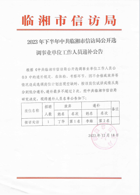 2023年下半年中共临湘市信访局公开选调事业单位工作人员递补公告