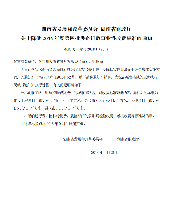 湖南省发展和改革委员会 湖南省财政厅 关于降低2016年度第四批涉企行政事业性收费标准的通知
