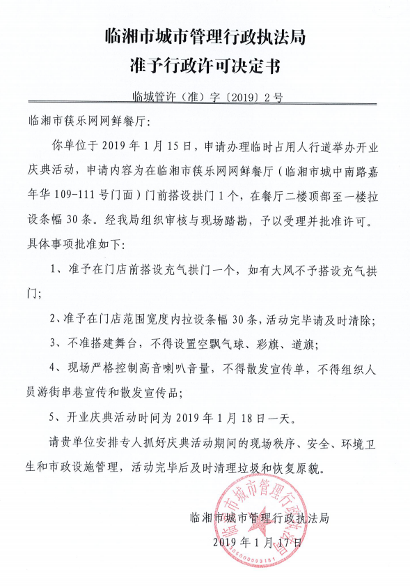 临湘市筷乐网网鲜餐厅办理临时占用街道两侧和公共场地