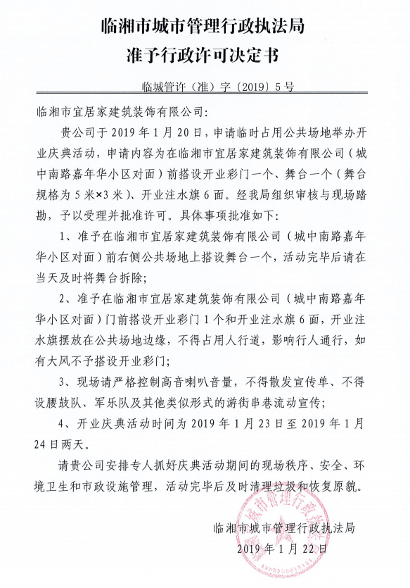 临湘市宜居家建筑装饰有限公司办理临时占用街道两侧和公共场地