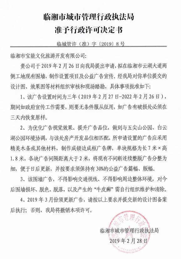 临湘市宝能文化旅游开发有限公司办理户外广告设置