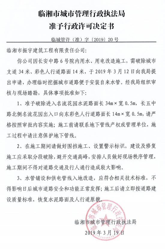 临湘市振宇建筑工程有限责任公司办理临时挖掘城市道路