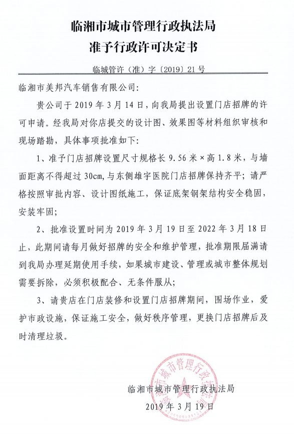 临湘市美邦汽车销售有限公司办理门店招牌设置