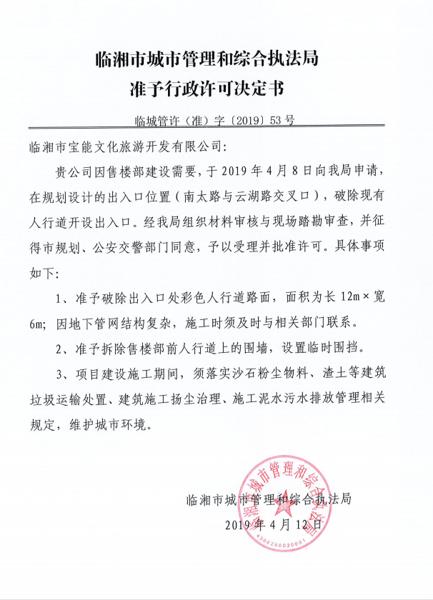 临湘市宝能文化旅游开发有限公司办理临时挖掘城市道路