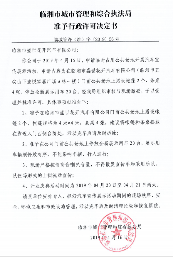 临湘市盛世花开汽车有限公司办理临时占用街道两侧和公共场地