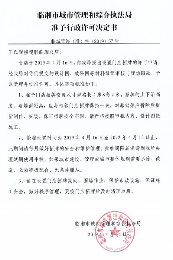 王氏现捞鸭脖临湘总店办理门店招牌设置