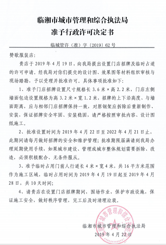 赞歌服装店办理门店招牌设置、临时占用城市道路