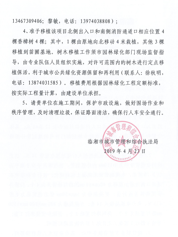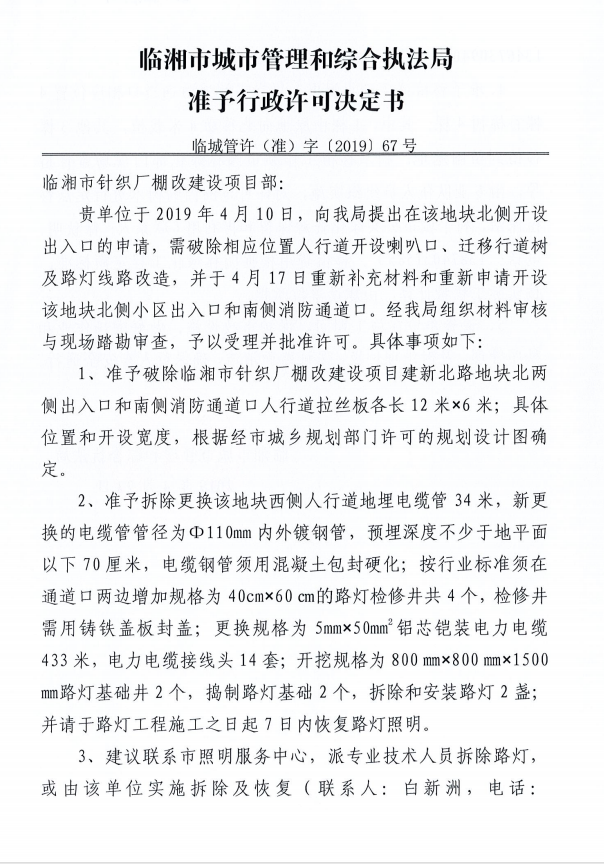 临湘市针织厂棚改建设项目部办理临时挖掘城市道路、拆除城市照明设施、迁移城市树木