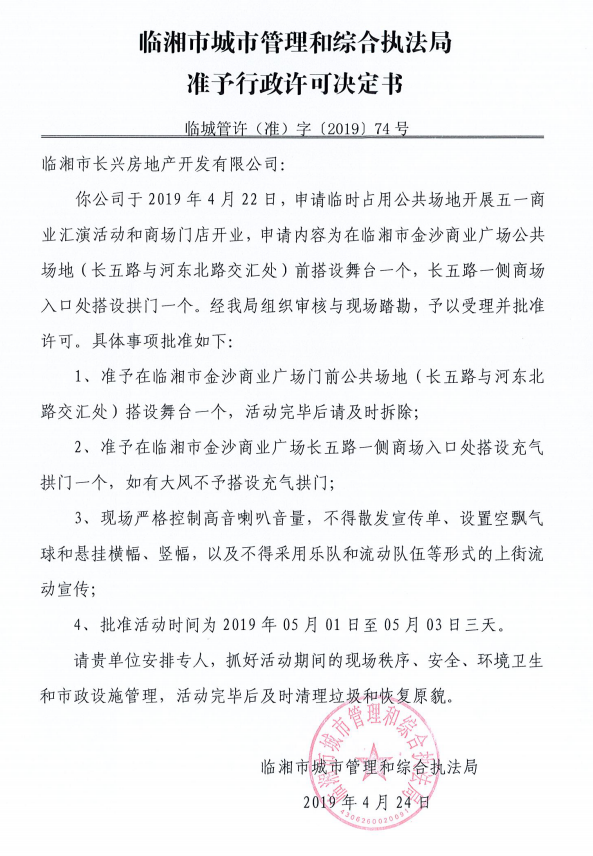 临湘市长兴房地产开发有限公司办理临时占用街道两侧和公共场地