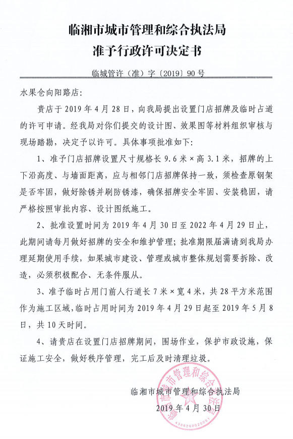 临湘市陈海波水果店(水果仓向阳路店)办理门店招牌设置、临时占用城市道路