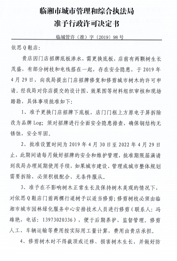 依思Q鞋店办理门店招牌设置、修剪城市树木