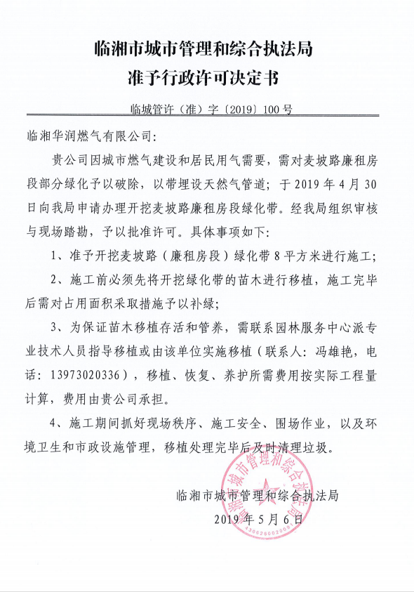 临湘华润燃气有限公司办理临时开挖城市绿地