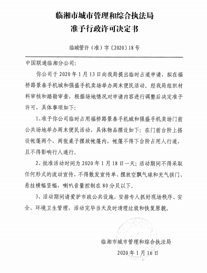 中国联通临湘分公司办理临时占用街道两侧和公共场地许可
