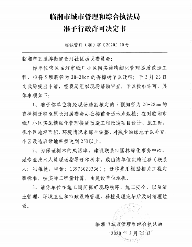 临湘市五里牌街道金河社区居委会办理迁移城市树木许可