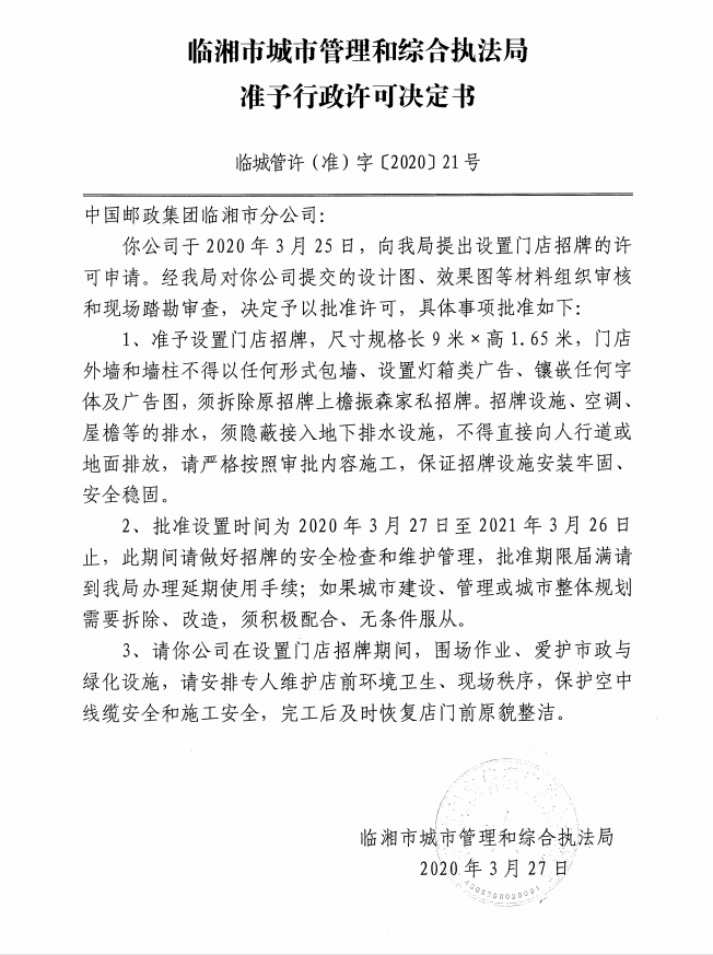 中国邮政集团临湘市分公司办理门店招牌设置许可