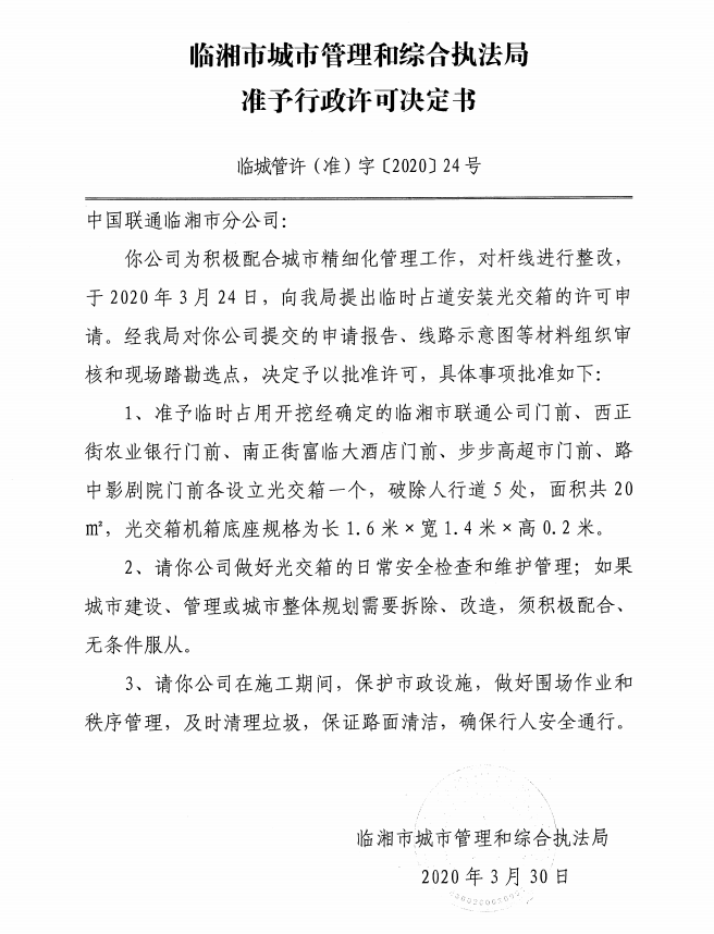 中国联通临湘市分公司办理临时挖掘城市道路许可