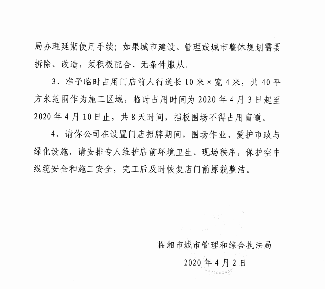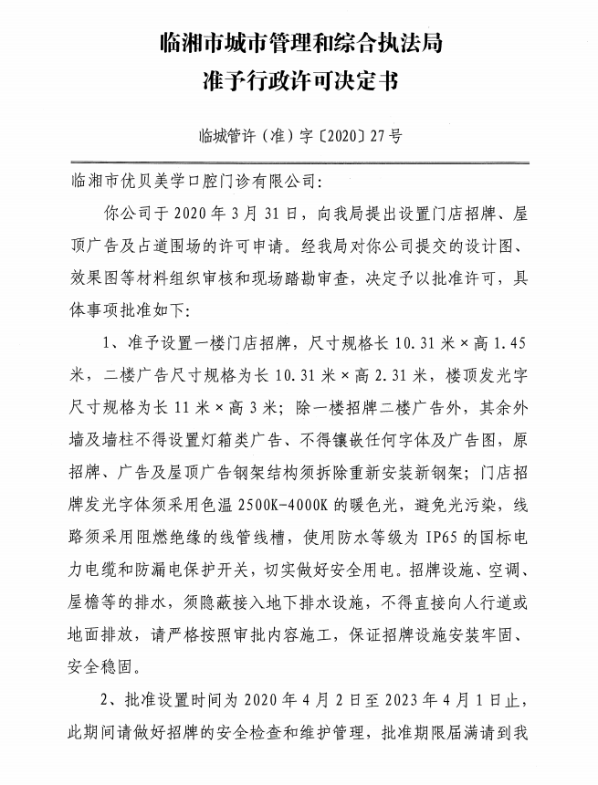 临湘市优贝美学口腔门诊有限公司办理门店招牌设置、屋顶广告、临时占用城市道路许可