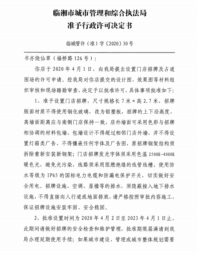 书亦烧仙草办理门店招牌设置、临时占用城市道路许可