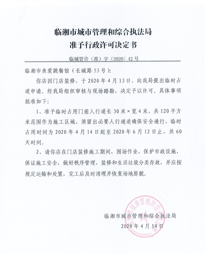 临湘市鱼爱跳餐馆办理临时占用城市道路许可