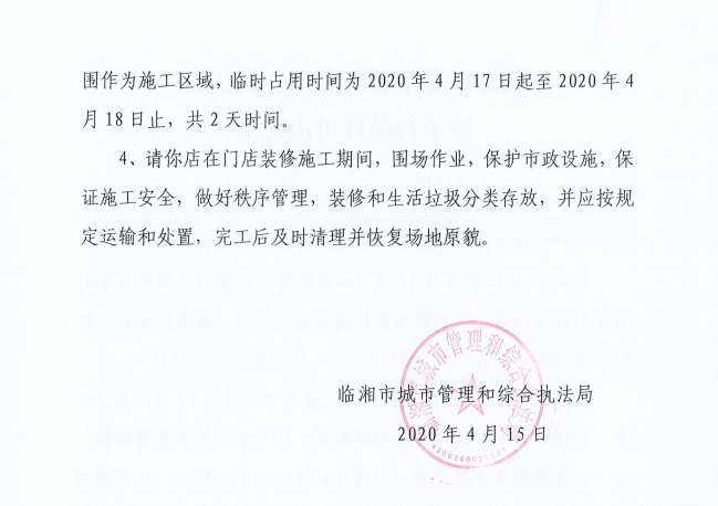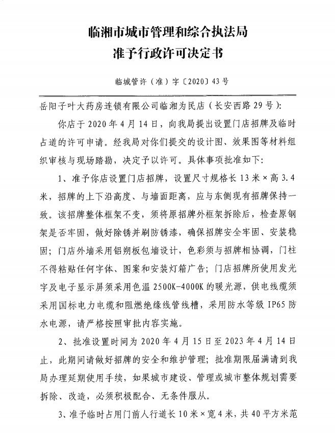 岳阳子叶大药房连锁有限公司临湘为民店办理门店招牌设置、临时占用城市道路许可