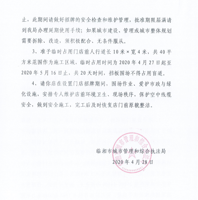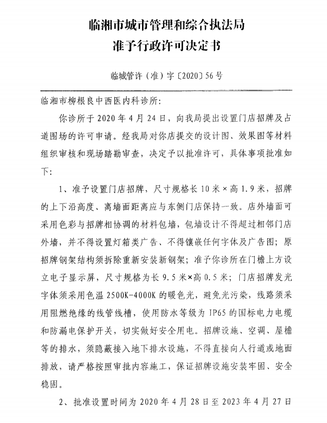 临湘市柳根良中西医内科诊所办理门店招牌设置、临时占用城市道路许可