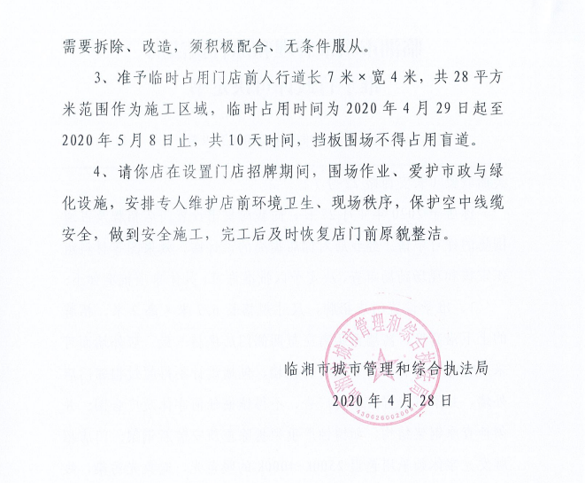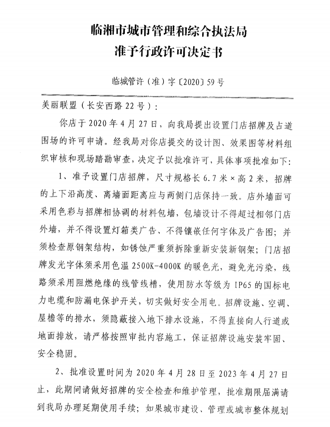 美丽联盟服装店办理门店招牌设置、临时占用城市道路许可