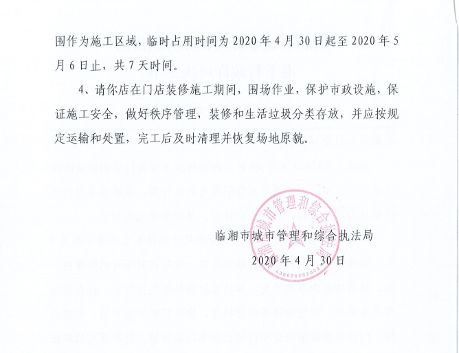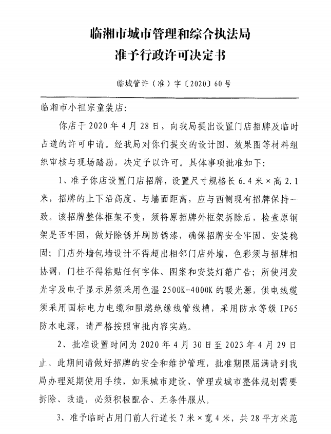 临湘市小祖宗童装店办理门店招牌设置、临时占用城市道路许可