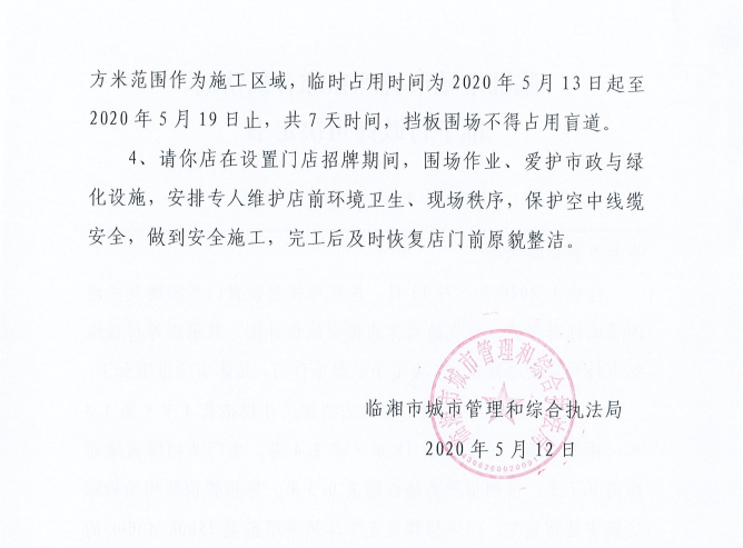 临湘市富临餐饮部办理门店招牌设置、临时占用城市道路许可