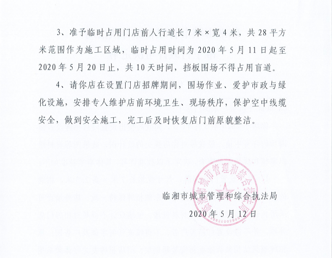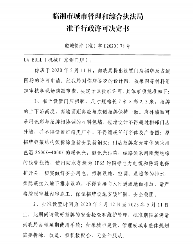 LA BULL服装店办理门店招牌设置、临时占用城市道路许可