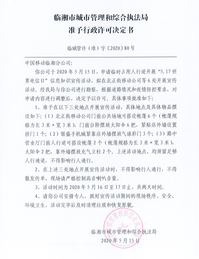 中国移动临湘分公司办理临时占用街道两侧和公共场地许可