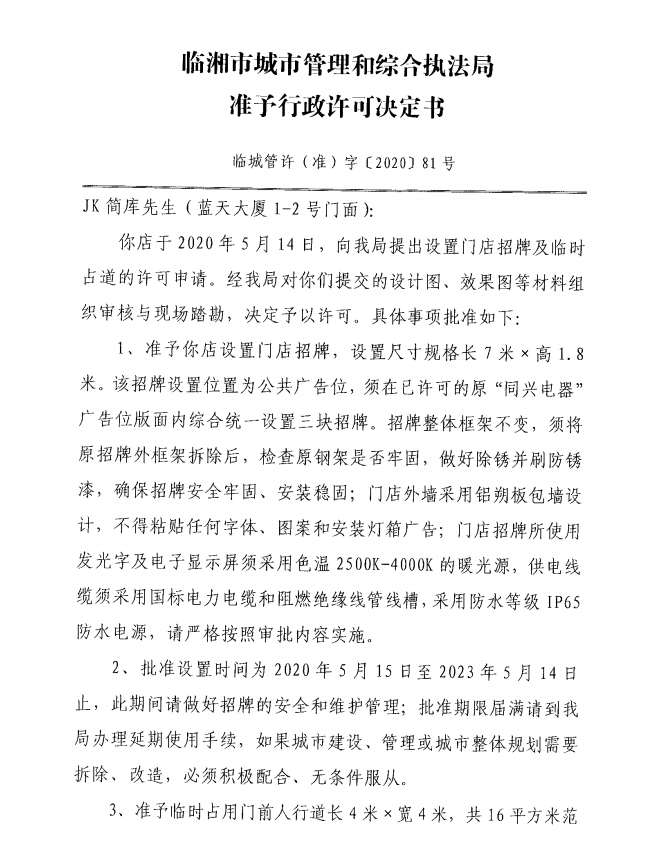 JK简库先生办理门店招牌设置、临时占用城市道路许可
