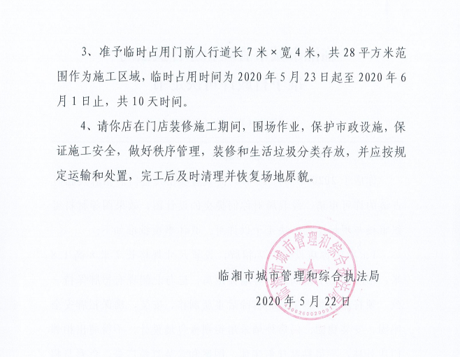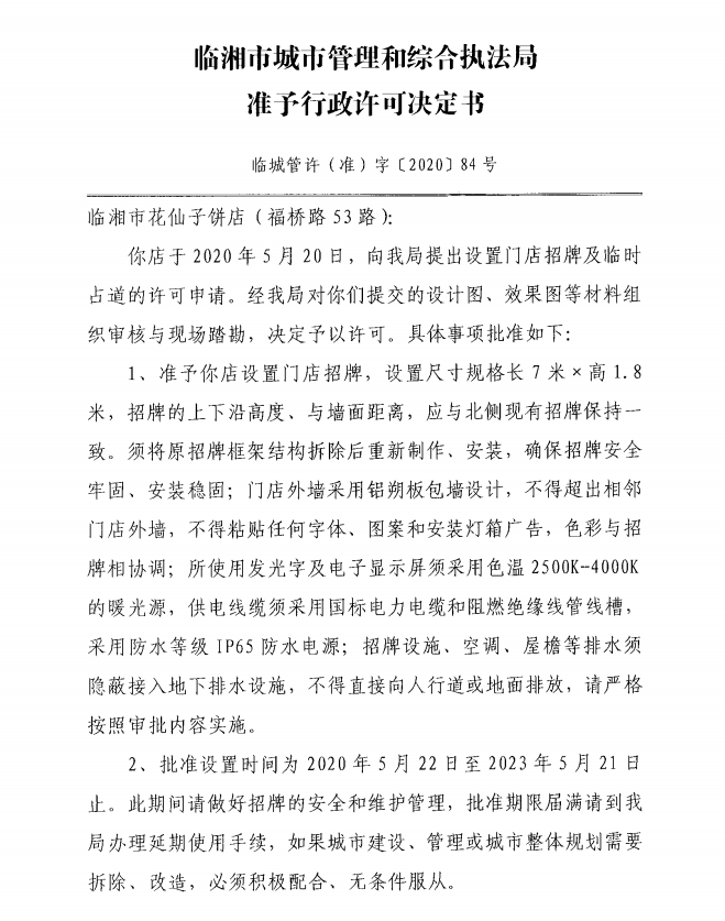 临湘市花仙子饼店办理门店招牌设置、临时占用城市道路许可