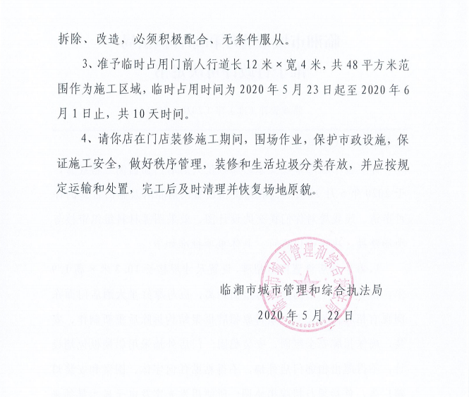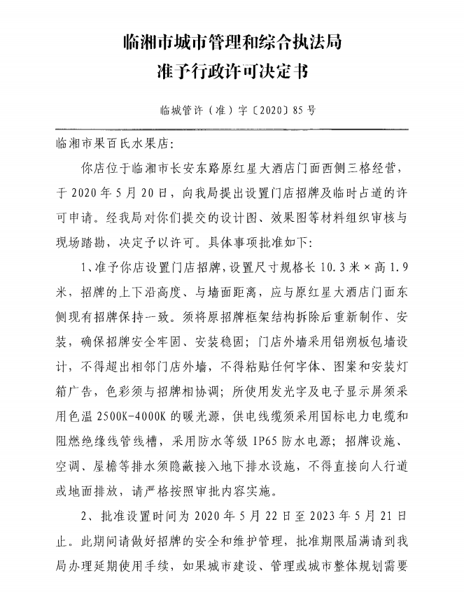 临湘市果百氏水果店办理门店招牌设置、临时占用城市道路许可