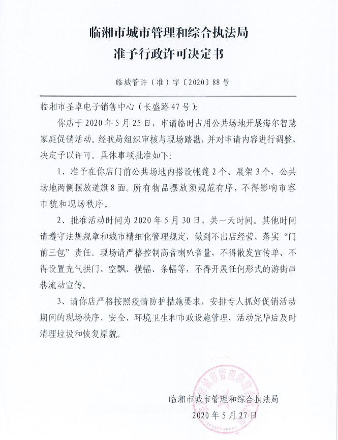 临湘市圣卓电子销售中心办理临时占用街道两侧和公共场地许可