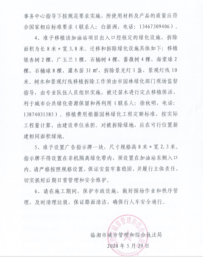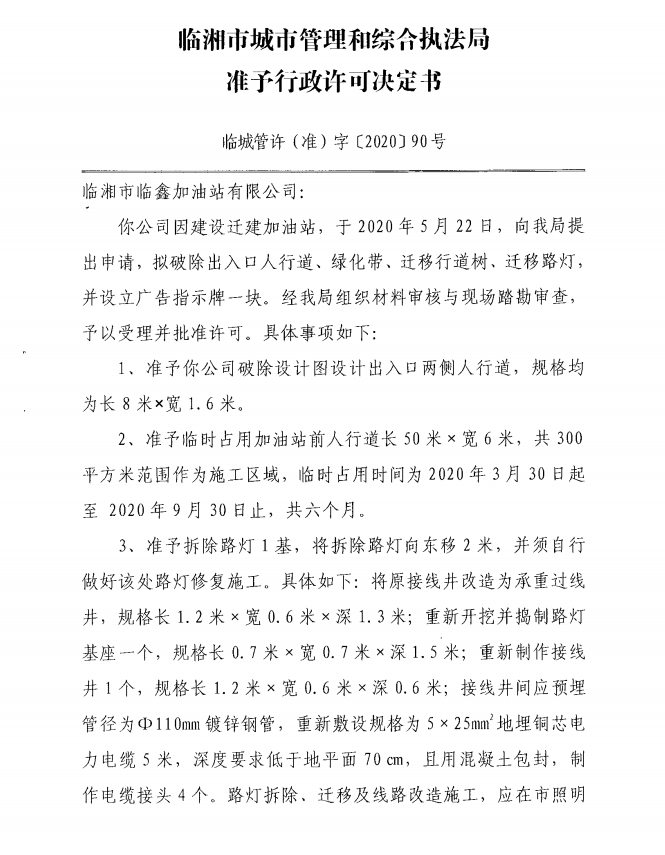 临湘市临鑫加油站有限公司办理挖掘城市道路、迁移城市树木、迁移城市照明设施、设置户外指示牌许可