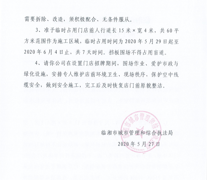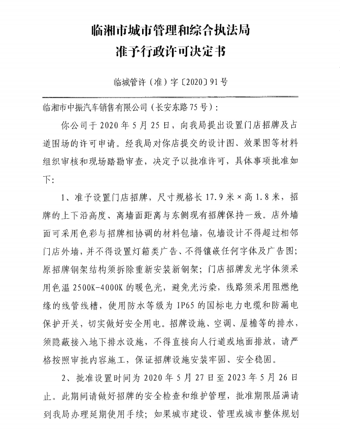 临湘市中振汽车销售有限公司办理门店招牌设置、临时占用城市道路许可