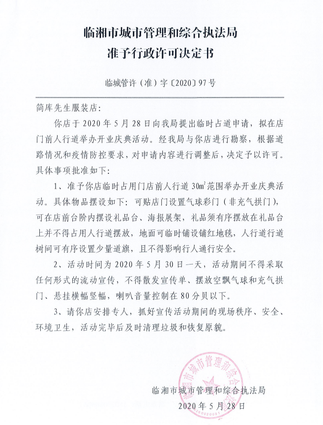 简库先生服装店办理临时占用街道两侧和公共场地许可