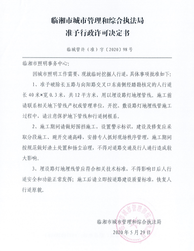 临湘市照明事务中心办理临时挖掘城市道路许可