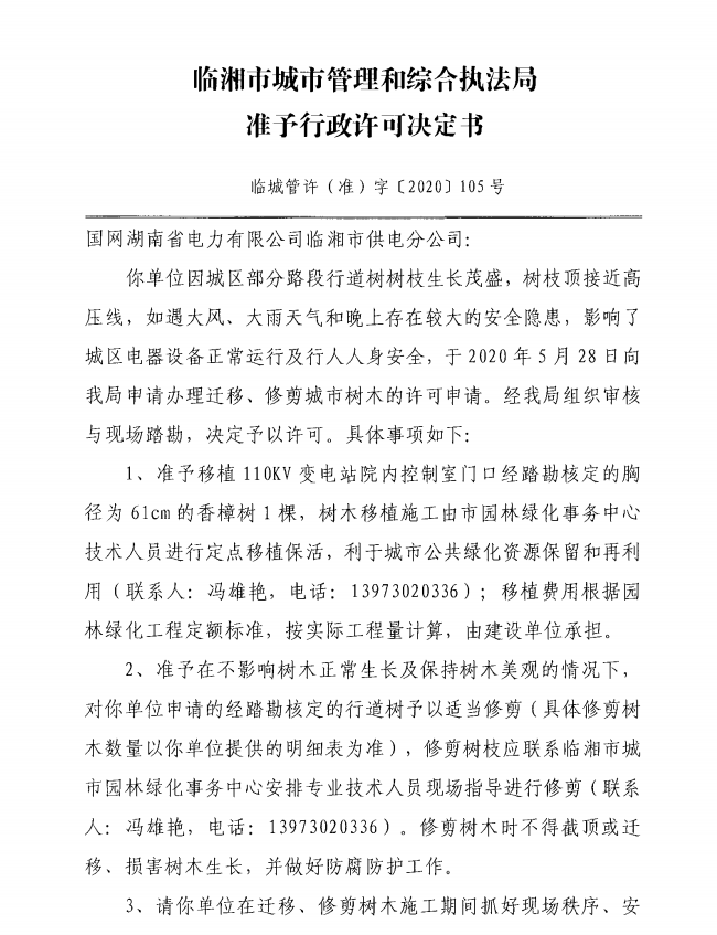 国网湖南省电力有限公司临湘市供电分公司办理修剪城市树木许可