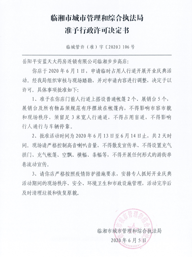 岳阳平安蓝天大药房连锁有限公司临湘步步高店办理临时占用街道两侧和公共场地许可
