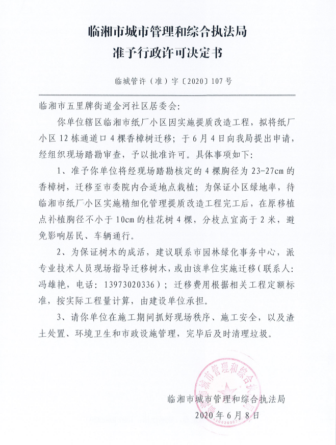 临湘市五里牌街道金河社区居委会办理迁移城市树木许可