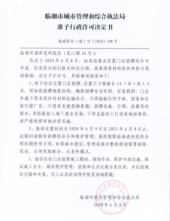 临湘市湘彩瓷砖胶店办理门店招牌设置许可