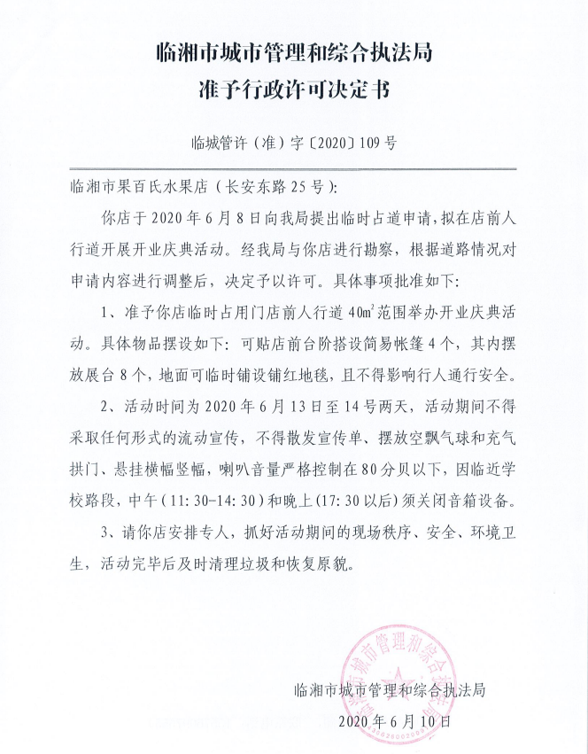 临湘市果百氏水果店办理临时占用街道两侧和公共场地许可