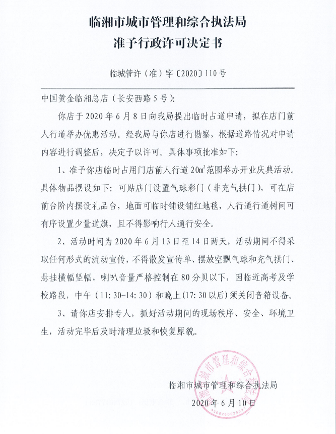 中国黄金临湘总店办理临时占用街道两侧和公共场地许可许可