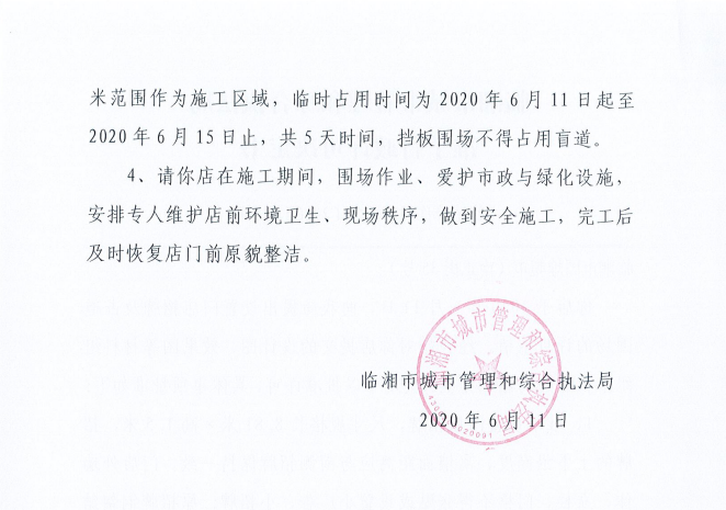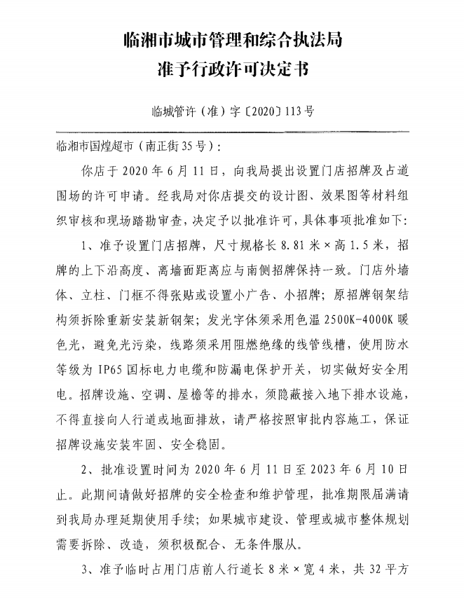 临湘市国煌超市办理门店招牌设置、临时占用城市道路许可